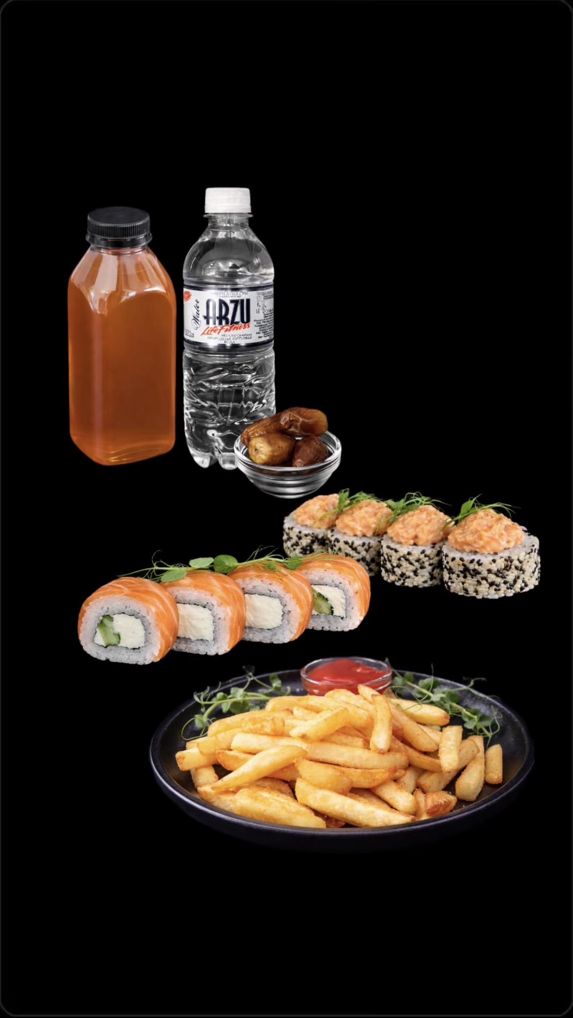 Филадельфия — 4 шт. Ролл в кунжуте — 4 шт. Картофель фри + кетчуп Компот — 0,5 л Вода — 0,5 л Финики — 2 шт.