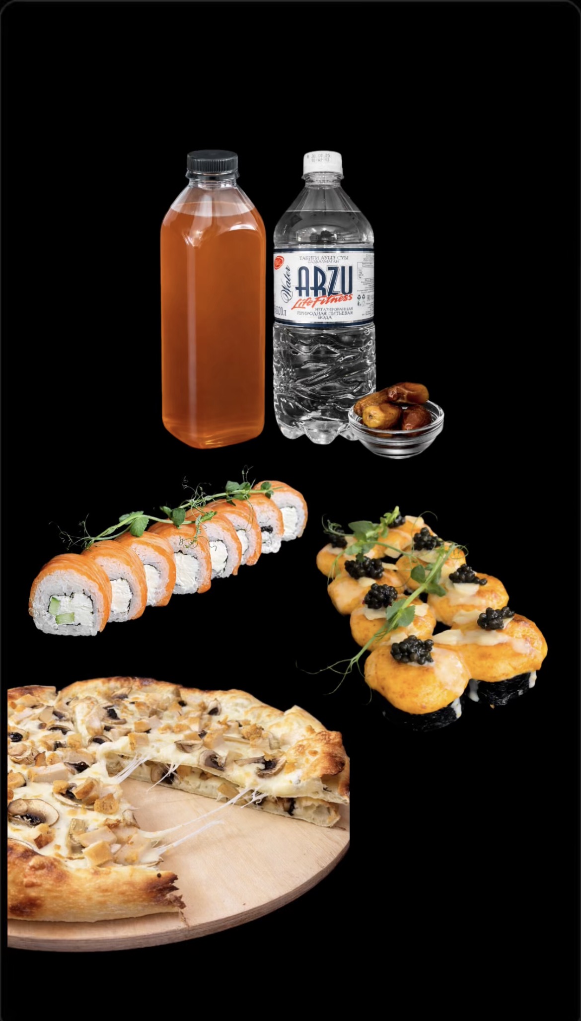 Филадельфия — 8 шт. Запечённый краб — 8 шт. Пицца «Курица с грибами» Компот — 1 л Вода — 1 л Финики — 4 шт