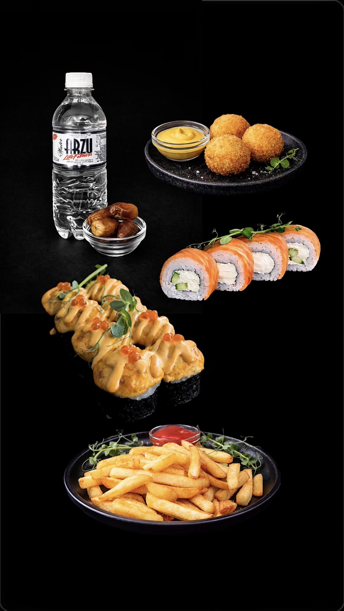 Запечённый лосось — 8 шт. Филадельфия — 4 шт. Сырные шарики — 3 шт. Картофель фри + кетчуп Вода — 0,5 л Финики — 3 шт