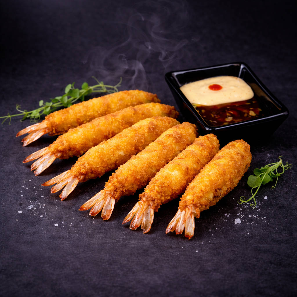 Крупные отборные креветки в хрустящем темпурном кляре. Мы используем креветки большого размера, чтобы сохранить сочность внутри и идеальный баланс хруста снаружи. Подаются с соусом.