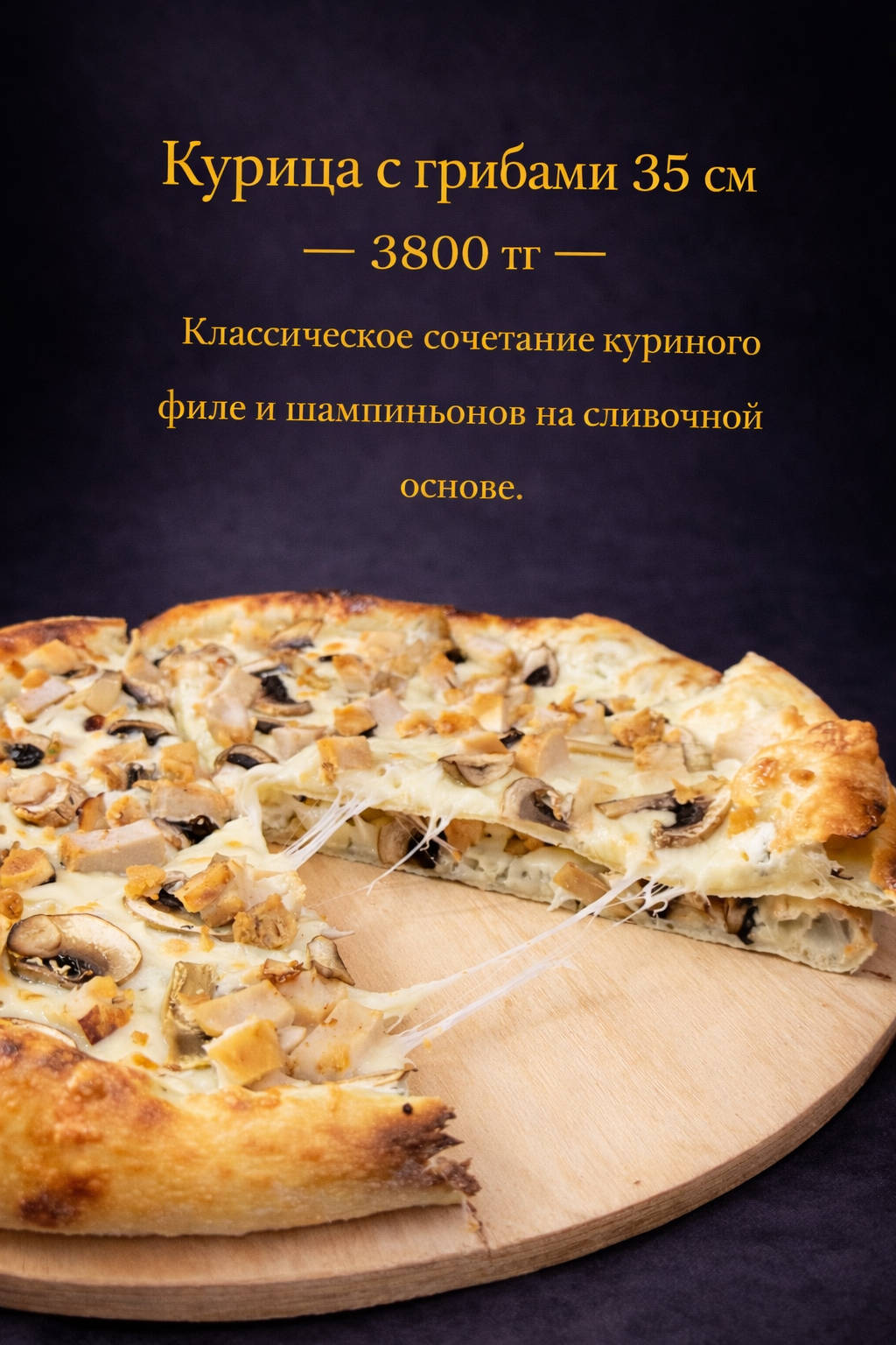 Нежная пицца с куриным филе и шампиньонами на сливочной основе, с тянущимся сыром и мягким вкусом.