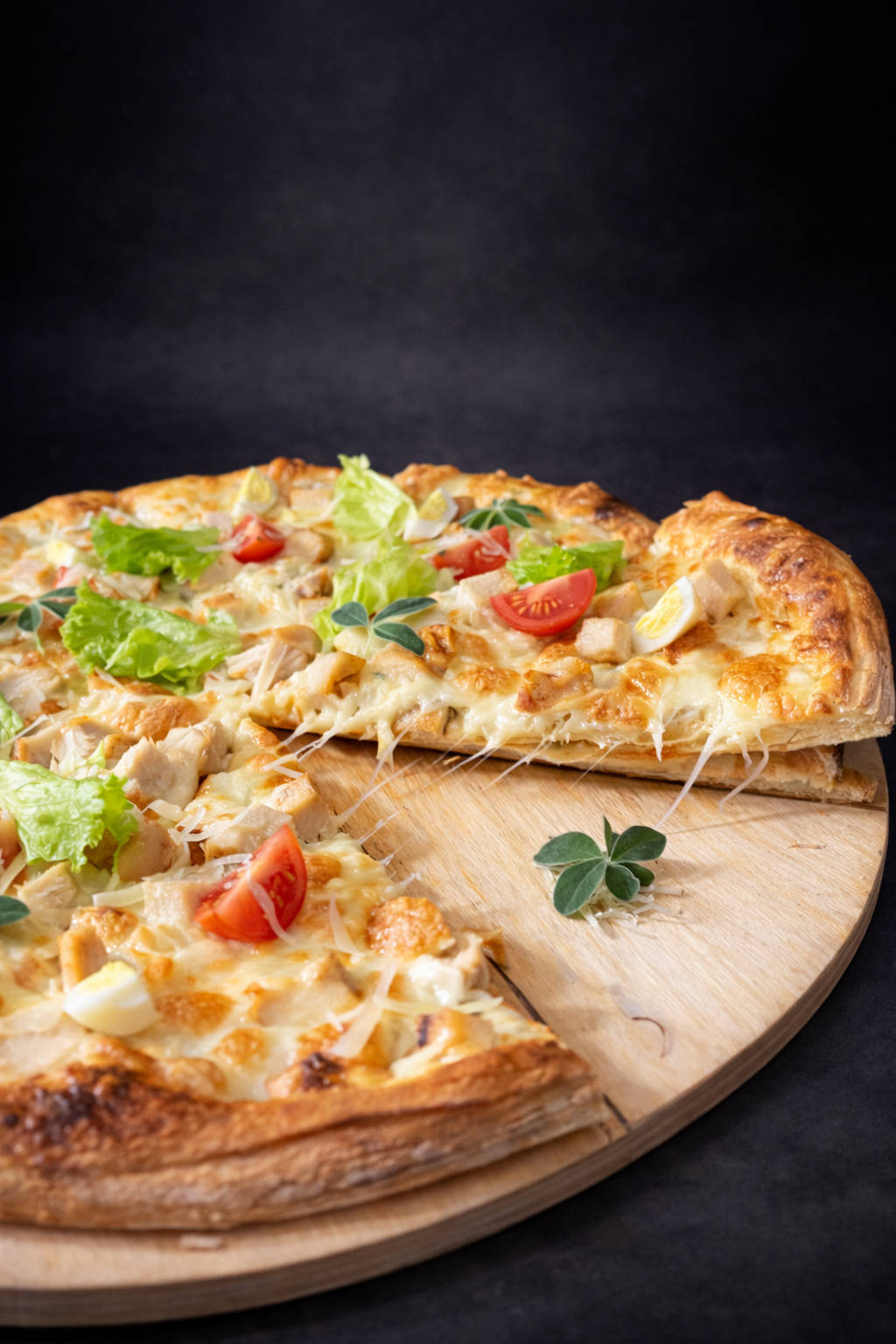 Горячая пицца с нежной курицей и тягучим сыром. Свежий салат и соус подаются отдельно, чтобы вы собрали пиццу перед подачей — так тесто и начинка остаются горячими, а салат — хрустящим и свежим.